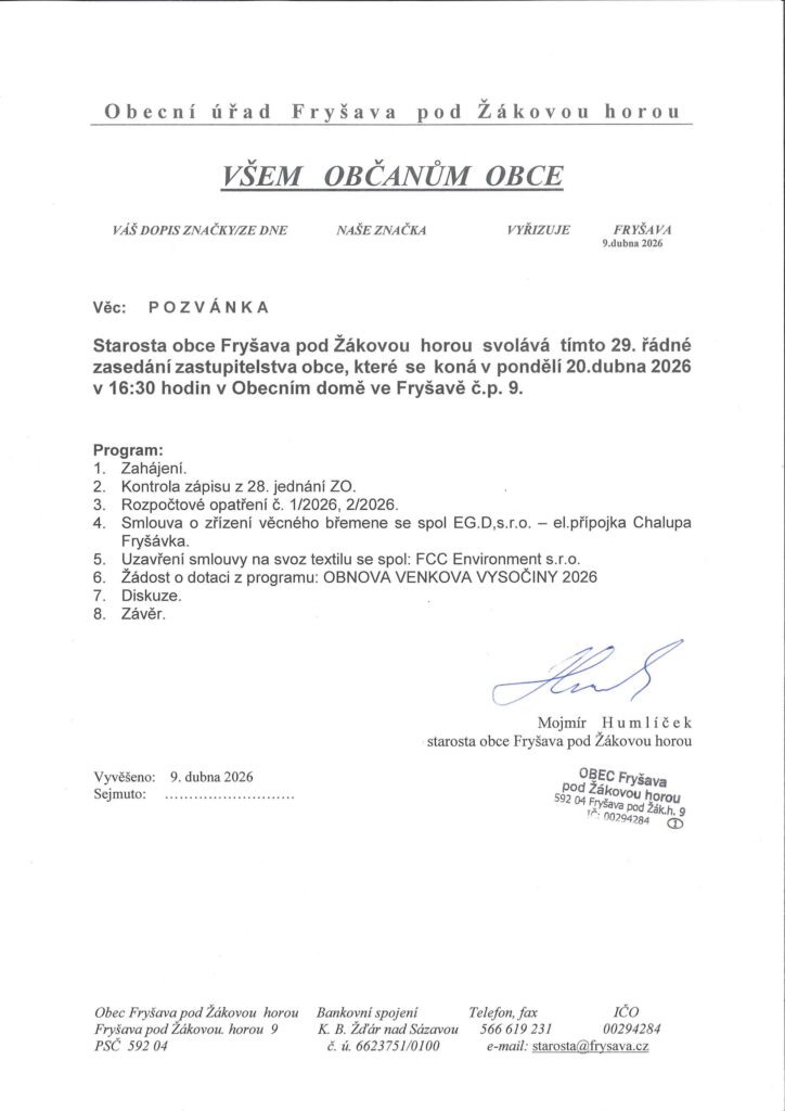 By Obec Fryšava, 9th Duben 2026 Filed under: Comments: Komentáře nejsou povolené u textu s názvem pozvánka 29.ZO